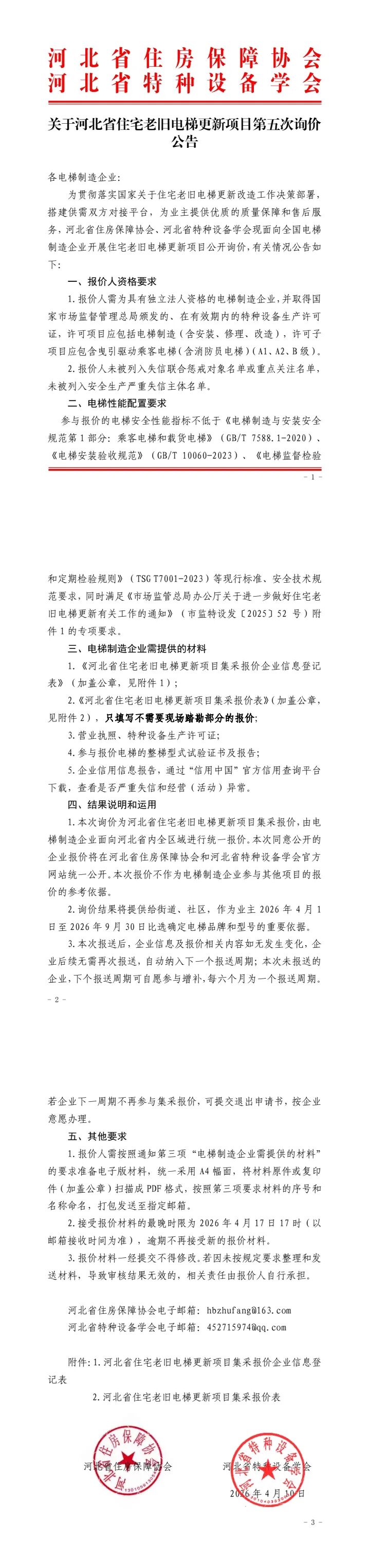 关于河北省住宅老旧电梯更新项目第五次询价公告